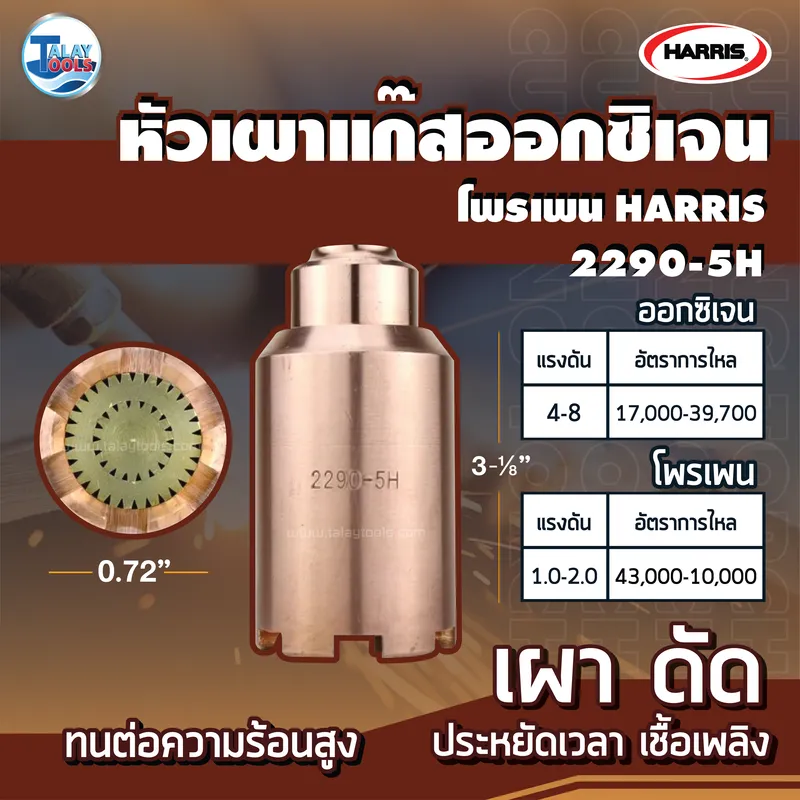 - HARRIS 2290-5H สำหรับงานหนักทนต่อความร้อนสูง ให้ความร้อนระหว่าง 96,000-223,100 KCal/Hr เป็นหัวสองชั้น ชั้นในเป็นทองเหลือง ชั้นนอกเป็นทองแดง