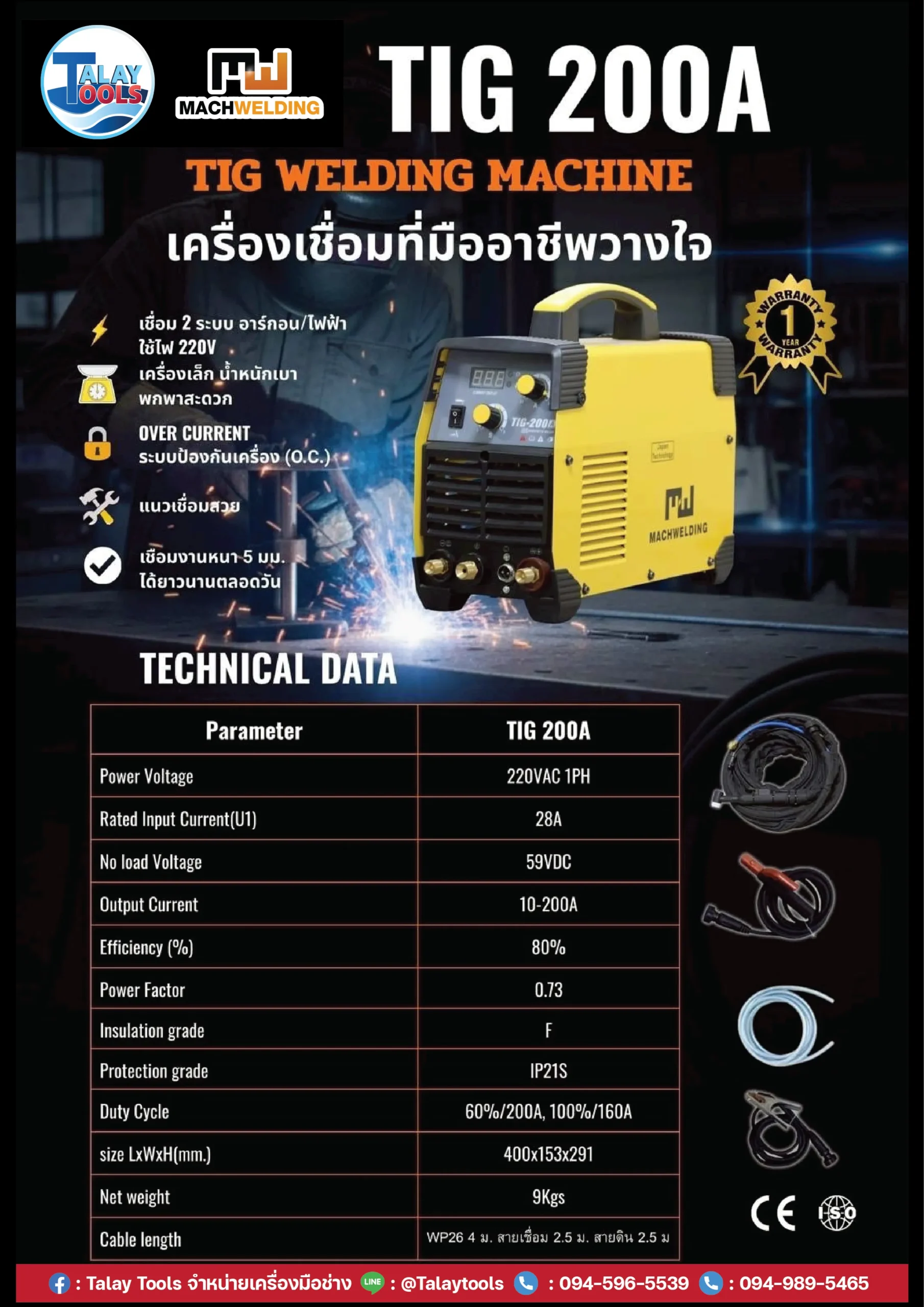 | กระแสไฟเชื่อม (A/V) | TIG 10/10.4-200/18 ARC 20/20.8-200/28 |