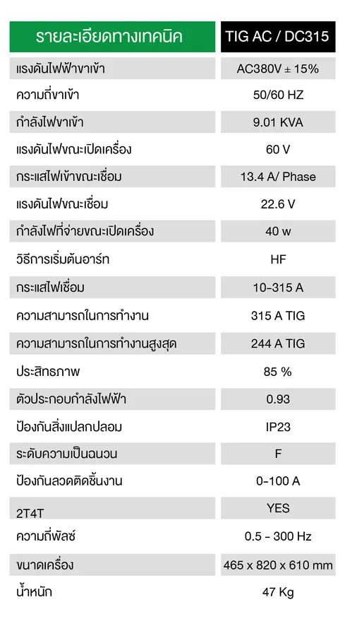 - รองรับขนาดลวดเชื่อม ทังสเตน 1.6-3.2 มม.