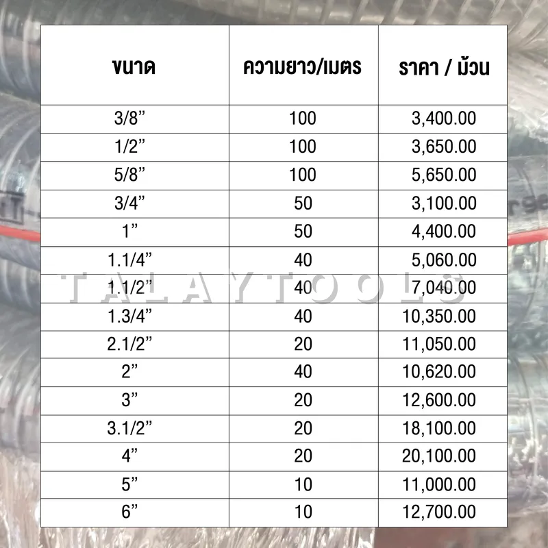 – สายชั้นเดียว (ไม่มีร่อน) / สีใส / ผิวเรียบ พร้อมชั้นลวดเสริมแรง